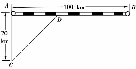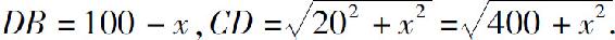 例11 铁路线上AB段的距离为100km.工厂C距A处为20km,AC垂直于AB,如图3.7所示.为了运输需要,要在AB线上选定一点D向工厂修筑一条公路.已知铁路每千米货运运费与公路上每千米货运的费用之比为3∶5.为了使货物从供应站B运到工厂C的运费最省,问D点应选在何处?