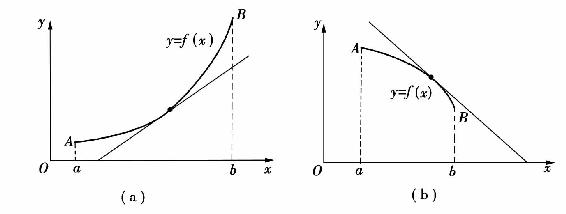 如果函数f(x)在[a,b]上单调增加,那么它的图形是一条沿x轴正向上升的曲线,这时曲线上各点处的切线斜率非负,即f′(x)≥0,如图3.3(a)所示;如果f(x)在[a,b]上单调减少,那么它的图形是一条沿x轴正向下降的曲线,这时曲线上各点处的切线斜率非正,即f′(x)≤0,如图3.3(b)所示.