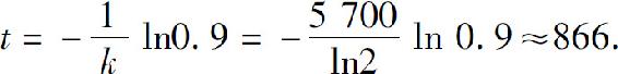 例6 利用碳-14测定年代.科学家用5700年作为它的半衰期.假设样本中原有的10%的放射性原子核已经衰减,求样本的年龄.