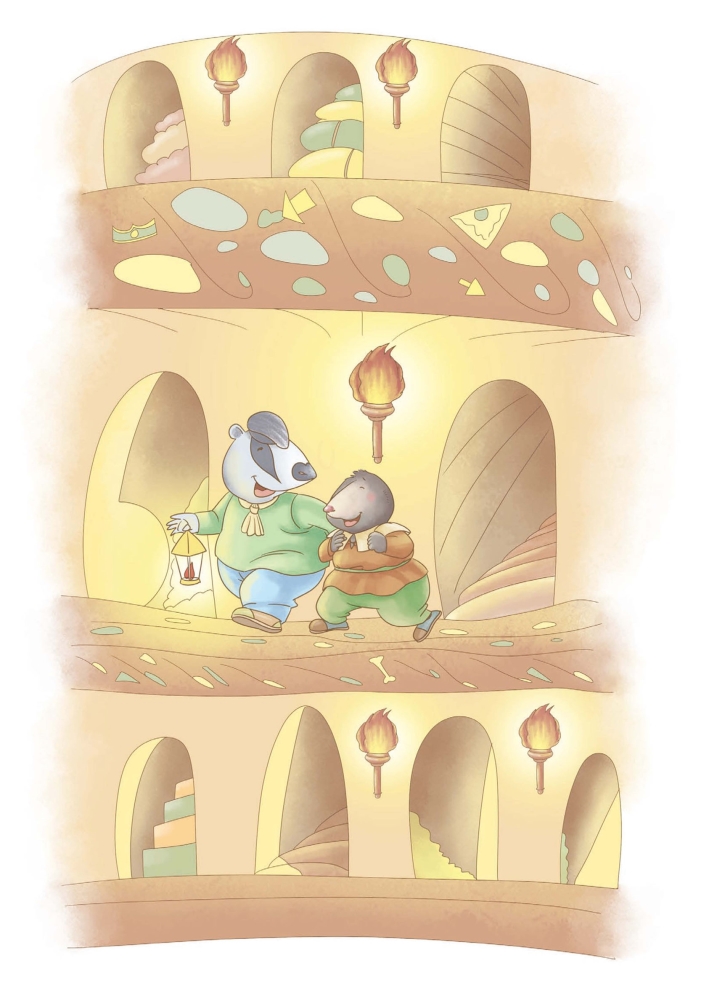 “吃过饭,你可以参观参观我的房间。”老獾说。于是,午餐过后,老獾点起一盏提灯,带着鼹鼠走出了厨房。河鼠和水獭坐在壁炉前,还在聊个没完。