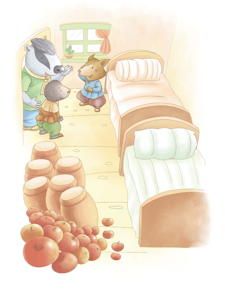 老獾带他们来到一间屋子,这屋子里面有苹果、萝卜、土豆、干果,还有一罐罐的蜂蜜。地板上摆着两张小床,被褥散发着香味。躺在这样的床上,只一会儿功夫,鼹鼠和河鼠就睡着了!