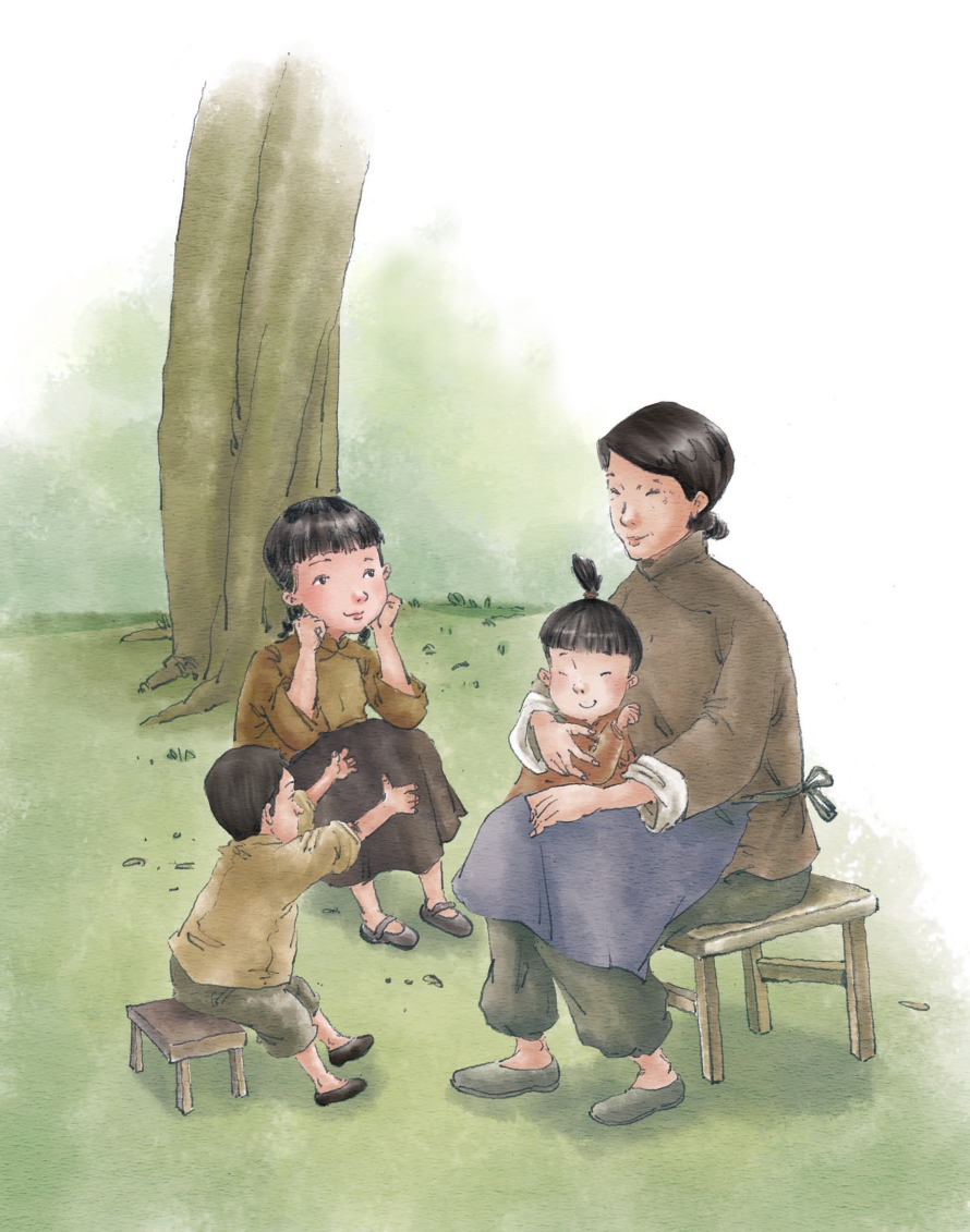 四只小板凳就摆在对门的大树阴底下,宋妈带着我们四个人——我、珠珠、弟弟、燕燕——坐在新板凳上讲故事。燕燕小,挤在宋妈的身边,半坐半靠着,吃她的手指头玩。