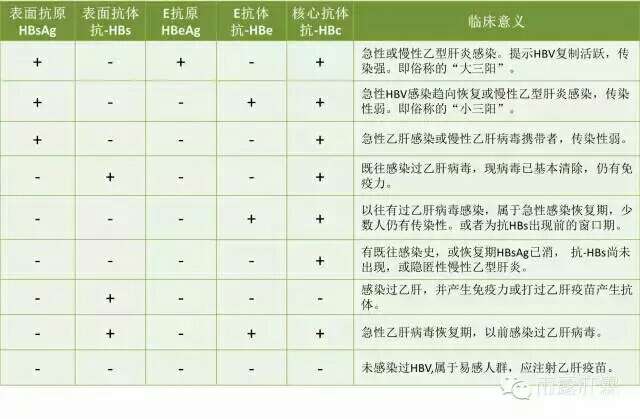 ①HBsAg、 HBeAg、抗 HBc(1 、3、 5项)阳性:急性或慢性乙肝。俗称 "大三阳" 。