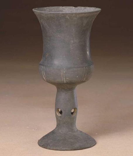 杯敞口,束腰,高柄足外撇,平底。杯身有凸出的弦纹为饰,高柄中空,柄外壁镂三孔。因采用了轮制方法,器壁较薄,素面磨光,配以镂空等多种工艺手法,制作十分考究,是一件精致的饮酒用具。