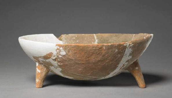 红陶三足钵,新石器时代磁山文化,高8.1cm,口径21.3cm,足距15cm。