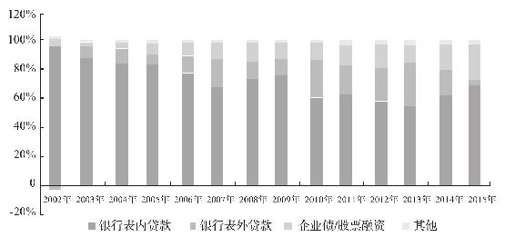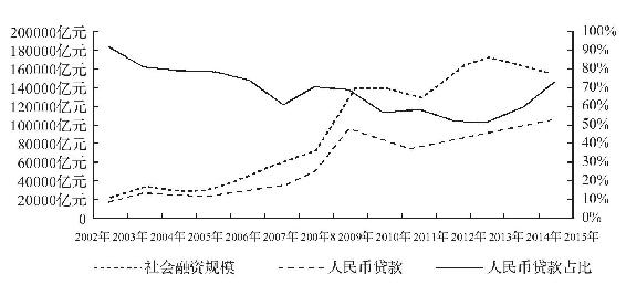银行资产方的金融脱媒可以从银行的贷款额得到反映。由图2-2可以看出,新增人民币贷款额的增长与社会融资总量的变动趋势虽然相同,但差距越来越大;从新增人民币贷款额占社会融资总量的比例来看,银行信贷在社会融资总量中的结构占比总体呈现下降的趋势,由2002年的91.86%降到2013年的51.3%,反映出其他50%左右的资金是通过银行信贷之外的融资方式来解决的,但这一比例在2014年和2015年有所反弹。