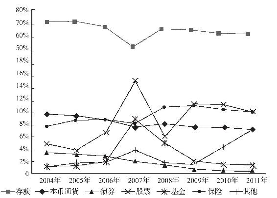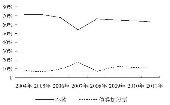 银行负债方的脱媒可以从银行存款额变化得到反映,也可以用居民存款额在金融资产中的占比对银行负债方的脱媒程度进行度量。由图2-3可以看出,一方面,居民存款在其资产配置结构中总体呈现下降的趋势,从2004年的71.8%下降到2010年的62.9%。由于2007年股市高涨,对银行存款的分流严重,存款占比一度大幅降至54.2%。另一方面,居民在股票、保险等金融资产配置上的占比也不断增加,股票资产从2004年的4.9%上升至2011年的10.3%,保险资产从2004年的7.8%上升至2011年的10.2%。