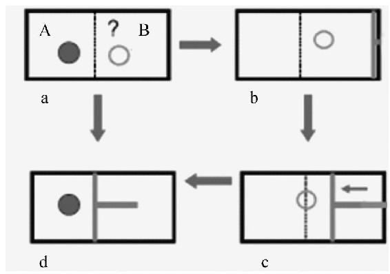 如图5-2所示,每产生一个比特的确定信息至少要通过麦克斯韦妖耗散k Tln2的热量。假设有一个信息盒子,盒子里面有一个分子。现在将盒子分为两部分,分子处于左边代表0、处于右边代表1。初始,我们不知道分子处于盒子的左边还是右边,这个时候系统是无知的,处在两边的概率相等,各为1/2,此时系统处于熵最大状态(kln2,k为玻尔兹曼常数)。如何才能使得系统的熵降低呢?假设有一个麦克斯韦妖等温地把图5-2c中所示的活塞向左边推,最后会确定地知道分子处于盒子的左边。此时,得到一个比特的信息。用热力学原理可以算出,这需要耗散k Tln2(T为环境温度)的能量。麦克斯韦妖理论很简单,就是一定要耗散一定量的能量,才能让信息本来不确定的状态即熵最大的状态,变成一个熵减小,而信息确定的状态。