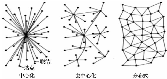 图5-3所示的中心化、去中心化和分布式网络对理解区块链很有帮助。中心化的系统中,除了中心节点是麦克斯韦妖,其他节点都没有决策权。而对于分布式决策系统,每一个节点都有一些决策能力,充当了系统的麦克斯韦妖,使得系统的熵值减小了。