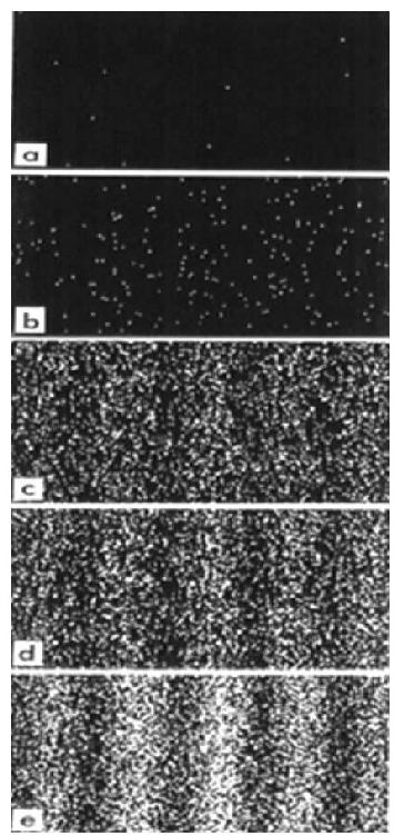 最终的实验结果究竟如何呢?单电子双缝干涉实验是殿村教授在1989年做的,这个实验在20世纪20年代就有人提出过,但是到了1989年实验结果才真正被物理学界所接受。[3]最主要的原因是这个实验需要严格的控制条件,每次打一个电子的操作是极其困难的。以前也有人号称进行过这样的实验,但物理学家们总在质疑他们可能多打了电子,所以实验没有说服力。在图8-2a中,开始可能打了10个电子,慢慢打,慢慢曝光,完全没有什么规律,完全是散的,但肯定不是只有两个光斑条的趋势,没有任何规律。图8-2b中可能稍微打多了一点,可能有几百个,满天星辰,没有规律,但肯定不是两个光斑条。图8-2c中可能已经打了几千个电子,好像能看出点规律,但肯定不是两个光斑条。图8-2d则很明显,屏幕上出现了明暗相间的条纹。图8-2e则更能说明问题了。