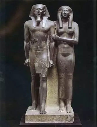 闪绿色粘板岩雕刻,高约142 厘米,约创作于公元前2600年,现收藏于美国波士顿博物馆。雕像刻划的是埃及古王国第四王朝第五个法老门考拉和他的王妃。国王夫妇并肩而立,两人身高几乎相等,人物的重心落在两腿中间,给人以安定稳固的感觉。法老本人两臂垂直,双手握拳,表示他是埃及力量的中心;王妃则左手弯曲放在法老的左臂上,右臂围绕在法老的腰间,姿态僵直呆板。法老夫妇的头都微微向上仰起,神态拘谨而威严,冷若冰霜的表情中似乎还带有一丝微笑,体现了“王权神授”的威严。王妃那薄而紧身的长衣,表现出女性柔软起伏的曲线和优美的体形,也体现了当时艺术家们高超的雕刻技巧。