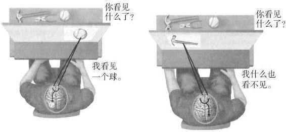 第一个测试中,用带有一排水平排列的灯泡的木板。患者坐在木板前,盯着中间的一个灯泡看时,这些灯泡将在其左、右视野依次闪烁。然而,当研究者要求病人报告他们看到了什么时,他们却说只看到板上右边的灯闪烁过。之后,研究者只让处于患者左视野上的灯泡闪烁,病人报告说他们什么也看不见。对于这一现象,唯一符合逻辑的结论是大脑的右半球是一个盲区。随后一件奇怪的事情发生了。灯泡再一次闪烁,这次要求患者指出灯泡闪烁的位置。尽管他们说只看到右边灯泡的闪烁,但他们能指出整个视野中的灯泡。使用了这种指认的方法后,我们发现大脑的两半球都能看见灯泡,并且在视知觉方面能力相当。在这里,重要的一点是病人不能说出他看到了全部灯泡,并不是因为他们不能看见,而是因为语言中心位于大脑的左半球。换言之,为了能说出你看见的东西,就不得不让你大脑的左半球看见这一物体。