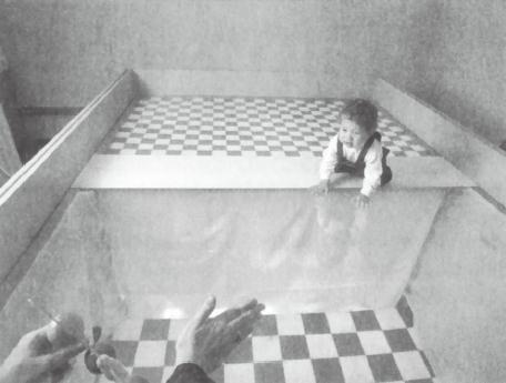 桌子的一半(浅滩)是用红白格图案组成的结实桌面。另一半是同样的图案,但它在桌子下面的地板上(深渊)。因此,从浅滩边上看,图案好像直接落到了地面,但实际上一块玻璃覆盖着整个桌面。在浅滩和深渊的中间是一块1英尺宽的中间板。使用这种装置对婴儿施测的过程十分简单。
