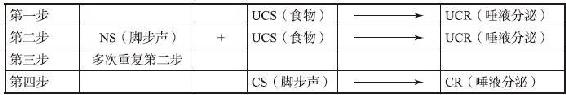 巴甫洛夫试图解决的问题是:条件反射既然不是先天性的,那么它究竟是怎样获得的呢?他认为当给狗喂食时,如果在狗所处的环境中经常出现一种特定刺激,那么在狗的大脑中,这种刺激将与食物建立联系,从而成为食物即将要到来的信号。在食物与刺激建立联系之前,这种环境刺激不产生任何重要反应。换言之,对于狗来说,它是一种中性刺激(NS)。当狗一旦进入实验室时,虽然实验人员的脚步声可能使狗产生一种好奇反应(巴甫洛夫称它为“是什么”反应),但是它并不能引起狗的唾液分泌,此时的脚步声为中性刺激。然而一段时间后,因为每天狗被喂食前都听到同样的脚步声,它们就开始把这种声音与食物联系起来。根据这种理论,最终,仅仅出现脚步声也能引起狗的唾液分泌。所以,依照巴甫洛夫的观点,表3—1列出了中性刺激转变成条件刺激的过程。