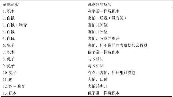 消极反应立即出现,艾尔伯特尽可能地远离动物,低声抽泣,然后大哭起来。我们让他触摸兔子时,他却把脸埋在垫子里,然后用四肢将自己支撑起来,边哭边爬走了(P.6)。