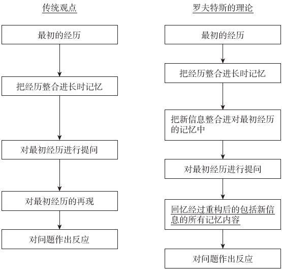 在上述研究及其他研究的基础上,罗夫特斯主张一种有关记忆和回忆的准确理论必须包括重构过程,即新的信息被整合到人对某一事件的最初记忆中去。这些研究结果并不能用回忆仅仅是心理上对一个事件的重放这一理论假设来解释,即使这种重放可以有不同的准确度。为了说明这些问题,图4—8对传统的回忆观点与罗夫特斯提出的新观点作了比较。新观点中增加了新信息整合到记忆中的过程,而传统观点中并不包含这一点。进而,这种新信息会使你原先的记忆表征得以改变或重构。随后,如果问你一个有关这个事件的问题,你回忆的将不再是原先实际发生过的事件,而是你对它的重构。罗夫特斯认为,重构过程正是谷仓、校车、推着婴儿车的女士和道路中央线这些在短片中根本不存在的事物会鬼使神差地出现在被试记忆中的原因。在提问中错误的前提假定为人们提供的新信息被无意识地整合进了最初的记忆中。