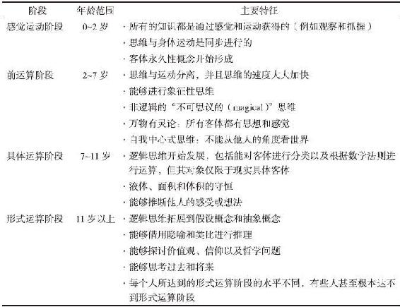 让·皮亚杰在他后来50多年的职业生涯中,一直致力于儿童智力发展的研究。他的工作使著名的认知发展理论得以产生,该理论无可辩驳地解释了人类获得复杂思维的过程。该理论认为,儿童的发展都要经过四个认知发展阶段,其顺序相同,年龄阶段基本一致,详见表5—1。