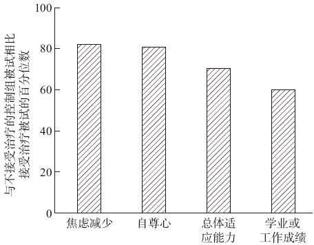 第二,将各种指标上的所有心理治疗的效果进行比较。结果见图9—1,从图中可清楚地看到,从总体上说,治疗比不治疗明显有效。
