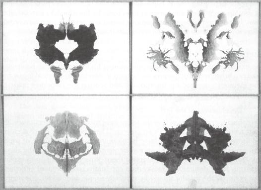罗夏对于墨迹图形如何制作的解释,听起来很像是创作有趣的儿童艺术作品:“制作这种随机图形非常简单:把少许大滴墨水滴在一张纸上,将纸对折,墨水就会在纸的两半对称地扩散。”(P.15)然而,简单的部分到此为止。罗夏进一步解释说,只有那些满足一定条件的图形才能使用。例如,图形必须相对简单,并对某些含糊的物体有适度的暗示。他还提出,图形必须是对称的,因为不对称的墨迹会由于难以解释而为被试拒绝。经过大量测试,罗夏最终确定了10个图形,组成了最早的罗夏墨迹测验。其中,五张图是黑白色,两张是黑色和红色,三张是彩色。图9—4呈现了罗夏所用图片类型的四张图形。