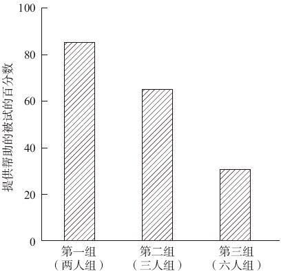 对于被试来说,这很显然是一个突发事件。毫无疑问,那名“学生”正处在危难之中,需要立即得到帮助。为了分析被试的反应,达利和拉特内测量了每一种实验条件下被试帮助危难学生的百分率(帮助行为指的是离开小房间,通知实验者有学生癫痫发作)。他们还测量了被试对突发事件的反应时间和提供帮助所花的时间。研究者给被试4分钟的时间作反应,之后实验停止,研究者询问被试相关情况。