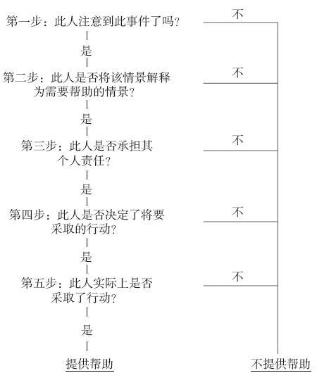 由于本项研究以及一些其他研究,达利和拉特内在助人行为和旁观者干预领域内成了开创性的研究者。他们早期的大量研究收录在他们的著作《反应冷漠的旁观者——他为何不帮助?》(The Unresponsive Bystander:Why Doesn’t He Help)一书中(Latané和Darley,1970)。在该书中,他们所描绘的助人行为模型在被有关助人研究的心理学文献广泛认可。他们提出大多数人介入某一突发事件前一般要经历5个步骤。
