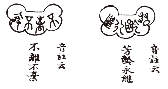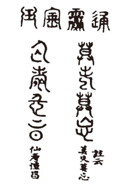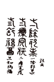 那顽石亦曾记下他这幻相并癞僧所镌(juān,刻)的篆文,今亦按图画于后。但其真体最小,方能从胎中小儿口内衔下。今若按其体画,恐字迹过于微细,使观者大费眼光,亦非畅事。故今只按其形式,无非略展些规矩,使观者便于灯下醉中可阅。今注明此故,方无“胎中之儿口有多大,怎得衔此狼犹(láng kàng,笨重)蠢大之物”等语之谤。