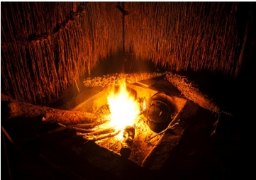 我国一些少数民族是以火塘为中心来进行住房空间的布局和分配。在这些房屋中,火塘被视为是火神、祖先神栖身之所,所以严禁对火塘的不敬和亵渎,比如任何人不许从火塘上方跨过,不准泼脏水或吐痰在火塘里等。于是,作为神圣空间的火塘,对家中世俗空间的划分有着重要的影响。(见图4-5)