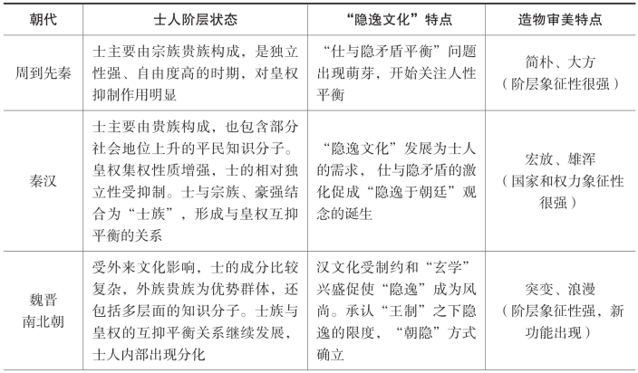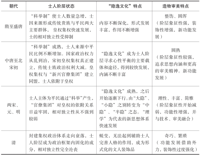 王毅先生在《中国园林文化史》中描述“‘隐逸文化’不断充实和完善……形成包括园林、诗文、绘画、品茗、饮食、琴棋、谈玄、斗禅、渔稼、游赏、讲学著述、收藏品鉴……直到生病养懒这样一个十分庞大,然而又高度统一的文化体系。”[23]可见“隐逸文化”不仅能调节人性平衡,还保证了士人的社会作用的发挥,它包含大量艺术和造物内容,是社会审美观的最佳载体。宋代的新士人体系,承担新政治下的巨大责任,“隐逸文化”因而更加快速地发展,形成“隐逸文化”与宋代建筑的园囿化发展相呼应的状态,表现出成熟、自然、洒脱的特点。表1-1对历史不同阶段造物审美与“隐逸文化”的发展做了比照,两者间表现出比较密切的关联。