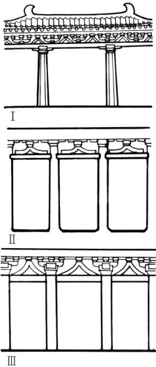 南北朝到唐,建筑大木作有了长足的发展,以柱与阑额的连接方式来看,在建筑结构上主要形成三种类型:Ⅰ型是柱式(包括柱身、柱础、柱头,柱头有单斗、斗拱、单斗加替木等式样)顶端承托整条阑额,阑额上再置枋或斗拱结构承托撩檐枋;Ⅱ型是柱式直接承托橑檐枋,柱头造型简单,为单斗或单斗加替木形式。阑额穿在柱身间,阑额上有人形拱辅助承托橑檐枋;Ⅲ型基本架构与Ⅱ型一致,不过柱式拥有了比较成熟的斗拱柱头,阑额穿在柱身顶端栌斗下方,阑额上有单个人形拱或没有斗拱,檐口出挑更深远(图2-8)[5]。