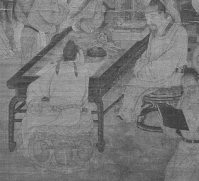 (5)七星燕几所用形制最有可能为束腰式。正文中“俗工每泥己见,为卓必放脚阔,两卓相竝中即开缝”说明桌常用做法是腿足向外放出,这有两种可能:一是如束腰家具的膨腿鼓牙,腿足可以放出比桌面更大;二是腿足侧脚做成马叉状,因而腿足比桌面更宽。这两种方式都会造成两桌相并中间有缝,作为组合家具当然不能取。设计者建议“敛下,广狭与上同”,那么又有三种可能性:一是在南宋绘画中经常出现的四面平桌案;二是腿足弯弧不超过桌面的束腰桌案;三是不带侧脚的案形结构,即腿足垂直向下的方式。七星燕几究竟是什么结构形制?“燕几”的称谓源自唐代,唐盛行壸门箱型四面平结构,但是四面平式样大体上都是上下一致的,除了托泥可能放宽之外,不符合“为卓必放脚阔”的做法,因此四面平式的可能性可以先排除。接下来是案型结构的可能。根据正文中设计者强调上下尺寸相同的意思,假设是案形结构,如果侧脚微弱些,腿足上端是在面子之内,尺寸比桌面要小,“敛下”的前提下,不必非要“广狭与上同”,因此案形结构的可能性虽然有,但是存在较大的疑问。剩下束腰式的可能性,即束腰桌案腿足收敛与桌面一致的做法。这可能最接近《燕几图》所采用的式样,约与刘松年《唐五学士图》、南宋佚名《梧阴清暇图》中文人赏古阅书的桌案类似,此类束腰膨腿的桌子是宋代文人在书画博古活动中喜爱使用的类型,具有大方稳重、造型讲究、制作精良的特点。