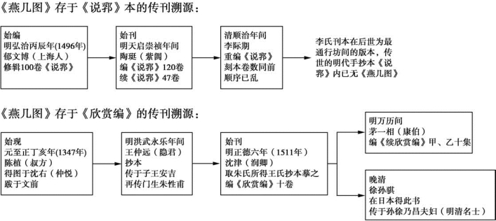 《燕几图》流传时间很长,所以在版本和作者问题上存在一些疑问。根据营造学社1934年重刊时的追溯,《燕几图》传世有两个版本。一为“李氏”《说郛》本,是坊间最通行的版本;另一为《欣赏编》内收存的版本,《欣赏编》有民国时期国立北平图书馆藏“沈润卿”本和故宫图书馆藏“茅一相”本。《说郛》一书为元末明初类书,收录了自上古到中古很多平时难见和散失的笔记资料,所谓“取经史传记,下迨百氏杂说之书千余家,纂成一百卷,凡数万条。”[1]它是一部杂糅的百科全书式古籍。而《欣赏编》的版本溯源则可以达到更早,相关的传抄者至宋末元初。现根据朱启钤先生的《教刊记》作《燕几图》的版本传承如下(图3-1):