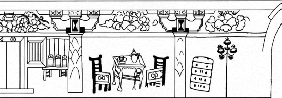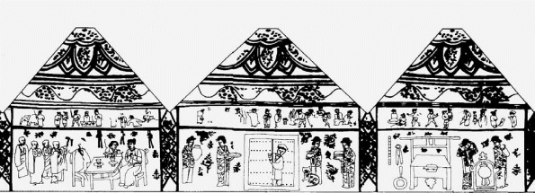 第三期是哲宗元祐元年到北宋末(1086—1127年),仿木构砖室墓大量出现,壁面装饰多姿多彩,墓主人夫妇对坐、伎乐、杂剧、升仙、礼佛、孝行图以及备宴、梳妆、书写等各种家居场面的装饰十分流行,门窗形式也从前一期的板门、直棂窗升级为格子门、棂花窗等。仿木构砖室墓中的砖雕常表现三类器具:尺、剪、熨斗、刀等一组小型用具;桌、椅、箱、柜、灯檠、衣架、镜台等一套家具;碗、盘、注子、盏托、瓮、经瓶等一套饮食器。这些北宋晚期的墓葬表明小木作与家具的发展都很快,高型家具已经普及,而且成套发展,一般居家环境都追求拥有完善多样的高型家具(图3-5、图3-6)。