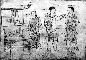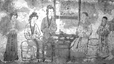 酒泉附近的5号墓有保存完好的十六国时期的大型墓室壁画,画面中心为燕居行乐图,墓主端坐在榻上,左手凭几,正观赏歌舞伎乐[14]。这一“过渡”时期起居的形象与宋代墓葬中墓主坐于椅上观赏伎乐、杂剧的同类形象形成呼应和对比,展现了生活中心的发展变化,原来以床榻为单一生活中心,至宋代则发展成床榻、桌椅双中心的形式。