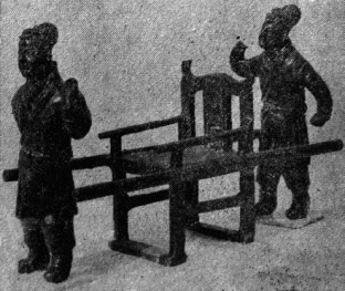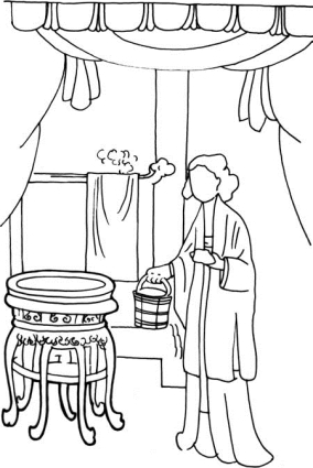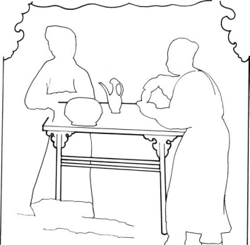 北宋晚期墓葬中家具的形象较北宋前期、中期细致些,尤其是衣架、盆架的形象,显得富于装饰感。例如河南登封高村北宋末年壁画墓中的衣架、盆架,在搭脑出头、腿足、牙条上施加富于曲线的雕刻,以盆架表现的高束腰家具已经与后世的香几形制非常相似(图3-10)[19]。还有在大庆发现的南宋初年《蚕织图》摹本[20],此图是南宋初年浙江於潜县令楼璹在高宗奠都杭州之前不久进献,表现的是北宋末年江浙地区的生产、生活,具有极强的写实性。图中有大量案型结构家具,包括大小桌案、床榻、条凳等,还有一件盝顶橱柜也采用梁架结构。家具形制简约、比例秀雅,尤其是案型结构家具前后无枨、侧面双枨的做法和曲线婉转的素牙,都说明江浙一带高型家具发展的水平较高,案型这类简单结构在北宋末已经趋于成熟。