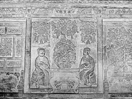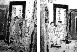 第二期是仁宗天圣元年到哲宗元祐年前(1023—1085年),平民墓葬出现仿木构砖室墓,总体装饰还比较简单,多数仅表现家具和用具,神宗后期开始出现椅上墓主人夫妇形象,有对坐、伎乐、出行和家居场面,桌上下出现了饮食器和用具。可见北宋中期高型家具渐行普及,大多数家庭都可以拥有一桌两椅的配置,风俗向家居享受方向发展。