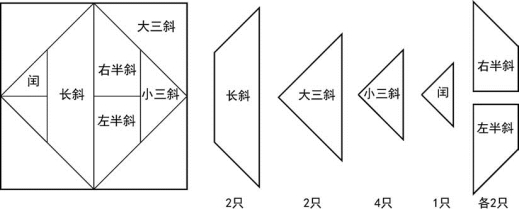 根据《蝶几谱》“十三只做式类”中描述,“蝶几”共13件:长斜几2只;左半斜、右半斜几各2只;三斜几有三种大小,大三斜2只,小三斜4只,还有大小为小三斜一半的三斜几——“闰”1只。这大小形状不同的6种几是根据《蝶几谱》给出的“几面样法”来确定的。戈汕以七尺见方的绵料纸板画线分割成形,用直尺快刀裁开作为式样标准,然后先将几面都做好,以纸模参照完全一样、排布结合无误后才配腿足。与黄氏“燕几”相比,“蝶几”与“七巧板”思路一致,多出游戏、炫耀的意味,设计者运用几何图形化整为零的原理,尝试突破组合家具的极限。