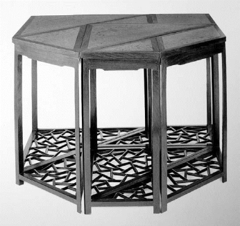 设计者为了变化更多,采用单数量的案几13件,并尽一切可能思考“几”组合的变数。设计完成后为了使之普及,戈汕在外甥毛子晋的协助下刊刻了图谱流传天下。此套几的功能与“燕几”相类,只是形式更复杂、变数更大(图5-5)。