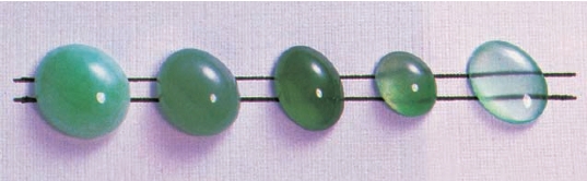翡翠的不同透明度  自左至右,不透明、微透明、半透明、亚透明、 透明(据欧阳秋美)