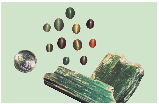 除了上述软玉品种,软玉中还有一种非常特殊的品种——软玉猫眼。软玉猫眼实际上是由透闪石或阳起石的纤维状晶体所构成的束状集合体。这种猫眼最初发现于我国台湾花莲,其产量一度占世界此类猫眼产量的80%以上,故有“台湾猫眼”之称。但历经40多年不断开采,矿源已濒枯竭。可喜的是,近年人们又在我国西南某蛇纹石石棉矿区发现同类猫眼,遂改称为“中华猫眼”。已知此类猫眼具有多个色彩不同的品种,如浅绿、暗绿、碧绿、浅黄、蜜黄、棕褐、深灰等色。有的可具有良好的猫眼效应。其中以蜜黄色、暗褐色为佳,尤以所谓“黑底银斑”最为名贵(这种猫眼的猫眼线格外明亮,如闪银光一般,故名)。
