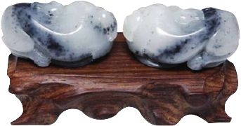(5)青花玉。和田软玉的新种,系在白色、青白色、灰白色或青色的底色上夹杂有云片状、星点状或条带状石墨形成的黑色斑块的品种。