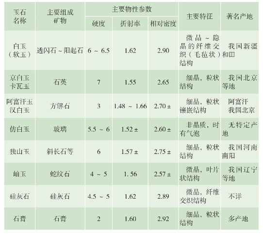 (4)石膏仿白玉。石膏是一种较常见的含水硫酸钙(CaSO4·2H2O)矿物。其白色具细粒结构的集合体,外观酷似白玉,因此也被一些人用来冒充白玉。但其白中微带灰色,油脂-玻璃光泽,微透明-不透明,折射率N=1.60(点测),相对密度2.92。根据其易被小刀刻动的低硬度(硬度2),极易与真白玉区分。另外石膏因含有结晶水,在热和干燥环境下易于发生脱水,致使该玉石发生崩解,不宜久藏。