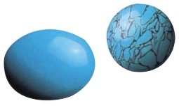 另外,1972年,法国的吉尔森(Gilson)公司推出了一种所谓的“合成绿松石”。它在化学成分和物理性质上与天然绿松石几乎完全一样,也可区分为致密块状的纯绿松石和铁线绿松石两种。但放大50倍后,可以发现它具有与天然绿松石不同的结构,是由无数紧密堆积在一起的微小的蓝色球粒构成,而天然绿松石则没有这样的结构。这使一些人认为,它不是真正意义上的人工合成制品,而是一种再造制品,即它是用绿松石粉末压结而成,所以称之为“再造绿松石”。现在且不管它究竟是怎样制成的,如果要鉴别它们,当然最好是观察到它的这种微粒结构;其次还可以通过分光仪的检查,天然的一般都含铁,会在蓝光区有一条弱-中等432纳米的吸收线;再造者则无。