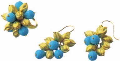 黄金镶嵌的绿松石戒指和耳环