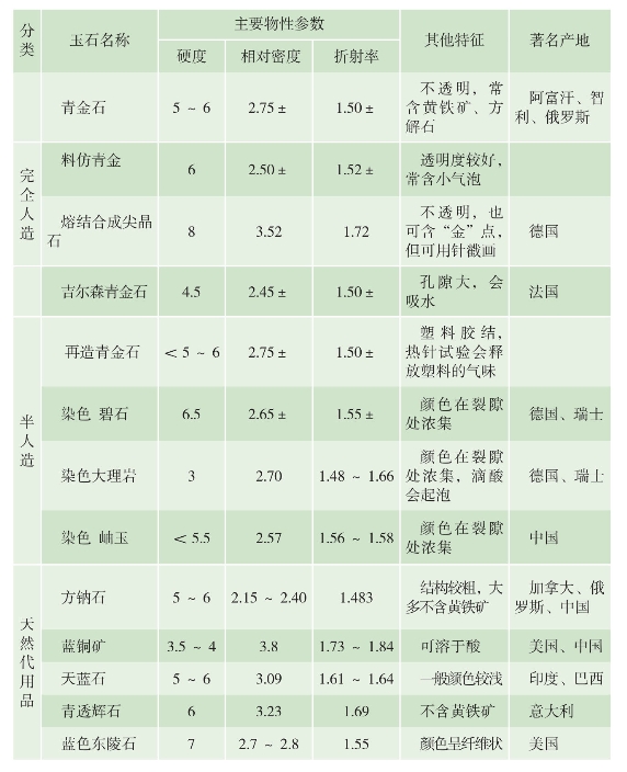 青金石及其仿冒品和代用品的鉴别一览表