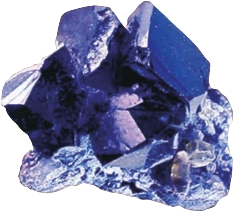 ⑥ 蓝色东陵石。是一种富含蓝线石的深蓝或紫蓝-紫色的石英岩。它主要来自美国的加州,而被人们称为“加利福尼亚青金石”,特点是通常都会具有较好的透明度,在透射光下放大观察,可见其蓝色呈纤维状分布,这与青金石显然不同。另外它的折射率也较高,为1.55;相对密度2.7~2.8,硬度7,也均高于青金石。