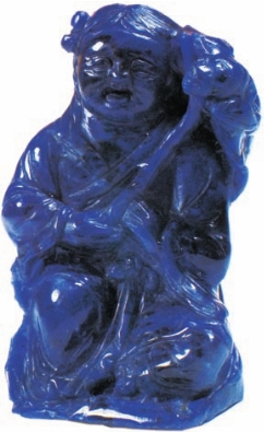 ③ 炝色青金石。我国工艺界生产一种青金石仿冒品,通常是用岫玉染色来获得。与天然青金石相比,它的折射率较高,硬度则偏低。