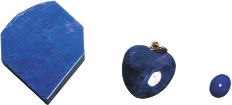 ② 德国青金石。也称“瑞士青金石”,实际上是一种用普鲁士蓝染色的碧石,或者是玉髓、大理岩等天然石料。它们通常不含黄铁矿,物性与天然青金石也有明显差异,是一种低级的比较容易识别的仿冒品。除了通常都可以看到染色剂在微裂纹处浓集外,若为染色的碧石或玉髓,可以看到有破裂后的贝壳状断口,且硬度较大,可以达到7。若为大理岩,则硬度低,只有3,并遇盐酸会强烈起泡。