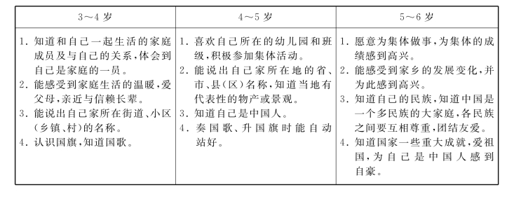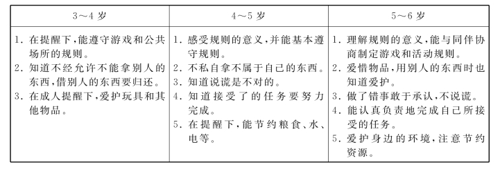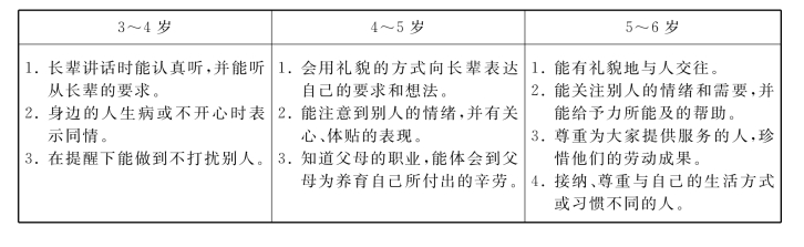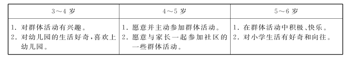 鉴于总目标具有高度的概括性,在指导幼儿园具体实施社会领域教育时,教师需对幼儿各年龄阶段的发展特点和水平有更细致的把握,才能制定出合理的学年目标和学期目标,并选择合适的教育内容,有效促进幼儿社会性发展。《指南》在对我国幼儿学习与发展状况进行大规模调查研究的基础上,基于3~6岁幼儿整体身心发展规律和学习特点,提出了幼儿在“3~4岁”“4~5岁”“5~6岁”三个不同年龄阶段在社会领域方面的发展与学习目标,从而,帮助家长和幼儿园教师树立对各年龄段幼儿发展的合理期望,制定出符合幼儿年龄发展水平和需要的阶段教育目标,进而实施科学的保育和教育,促进幼儿健康、快乐成长。