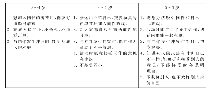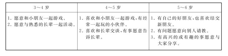 《指南》从人际交往和社会适应两方面对社会领域的教育目标进行阐述。其中,人际交往包括愿意与人交往;能与同伴友好相处;具有自尊、自信、自主的表现;关心尊重他人。社会适应包括喜欢并适应群体生活;遵守基本的行为规范;具有初步的归属感。同时,《指南》还列出了上述每条具体目标在“3~6岁”三个不同年龄段的具体表现和教学建议。具体如下: