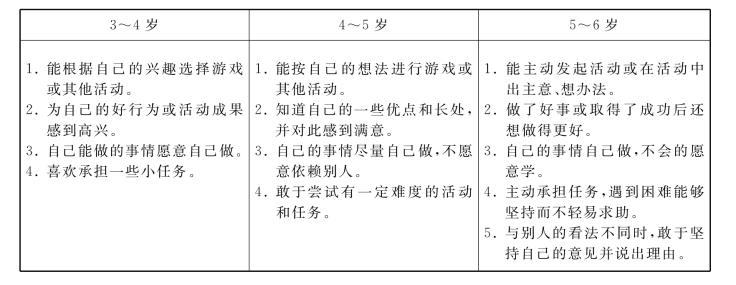 从上文所述可知各国、各地区的具体教育目标各不相同。例如,我国的课程纲要着重强调培养幼儿的自信;日本的重点和核心是提高幼儿的自主性;英国强调帮助幼儿形成积极的、良好的自我形象和自我感觉,提高自我价值感;美国除了提出帮助幼儿形成积极的自我概念、发展幼儿的自信心之外,还提出发展幼儿的自我控制能力;加拿大则强调幼儿自信心和自我意识的培养。